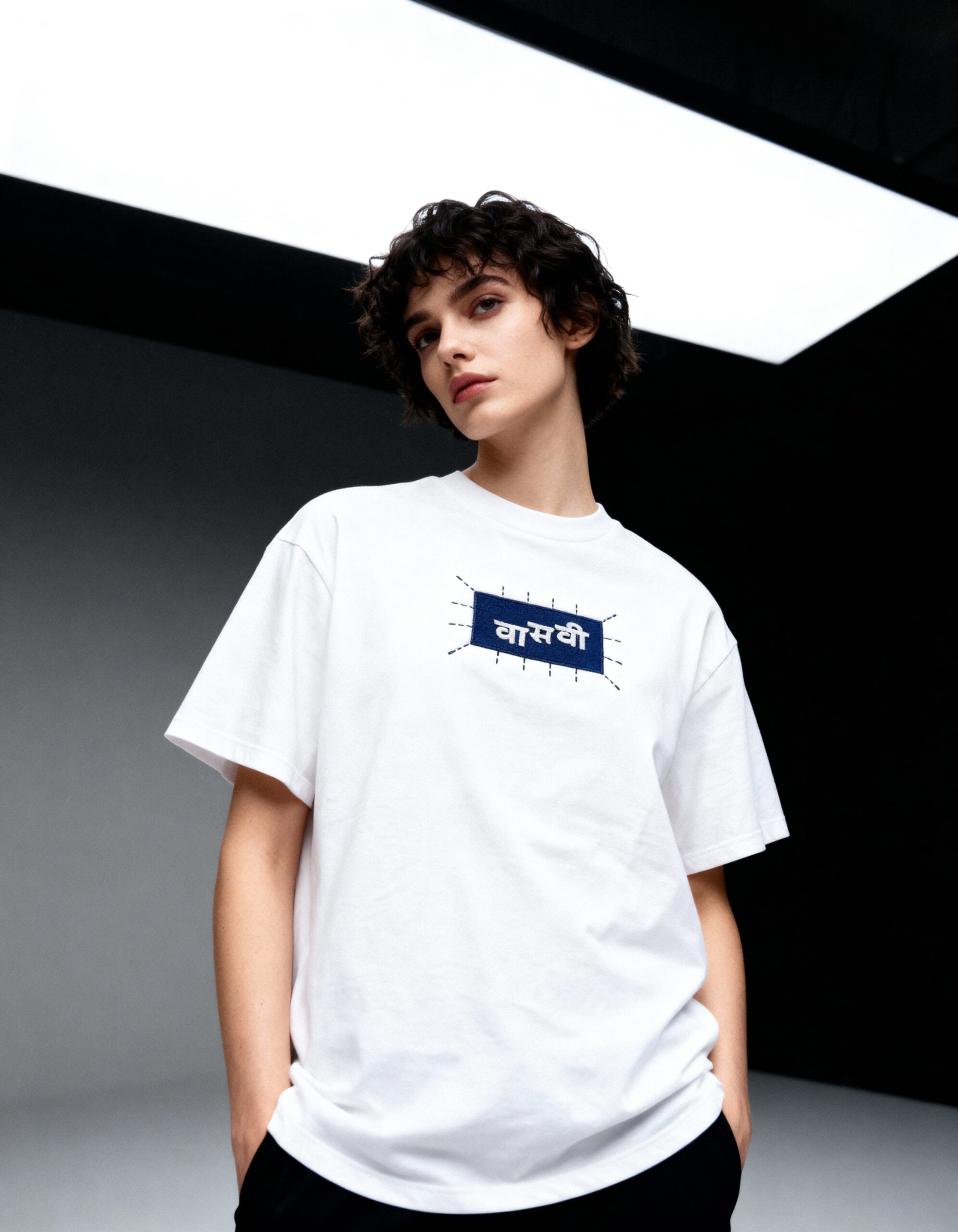 This white t-shirt blends classic denim with modern design, combining timeless fabric with contemporary details. The embroidered brand logo and hand-stitched lines pay homage to traditional craftsmanship, while the unique denim patch brings a future-forward twist to a classic piece.