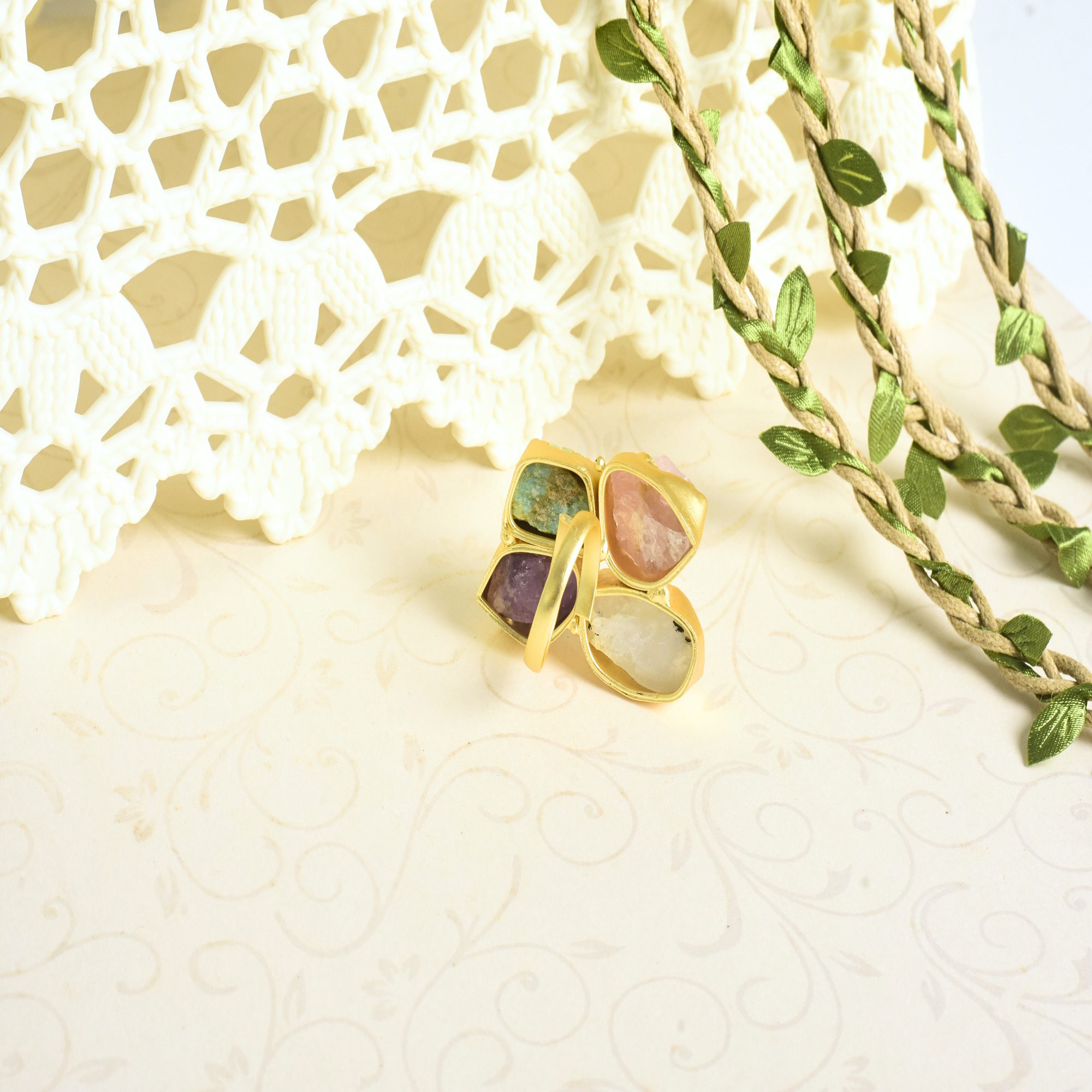 A bold statement of raw beauty, the Elemental Harmony Ring features four distinct semi-precious stones, each set in handcrafted silver. The organic textures and uncut gemstones ranging from deep green, vibrant blue, rich purple, and soft pink symbolize the balance of nature’s elements. Designed for those who embrace individuality, this ring is a celebration of raw elegance and artistic craftsmanship.