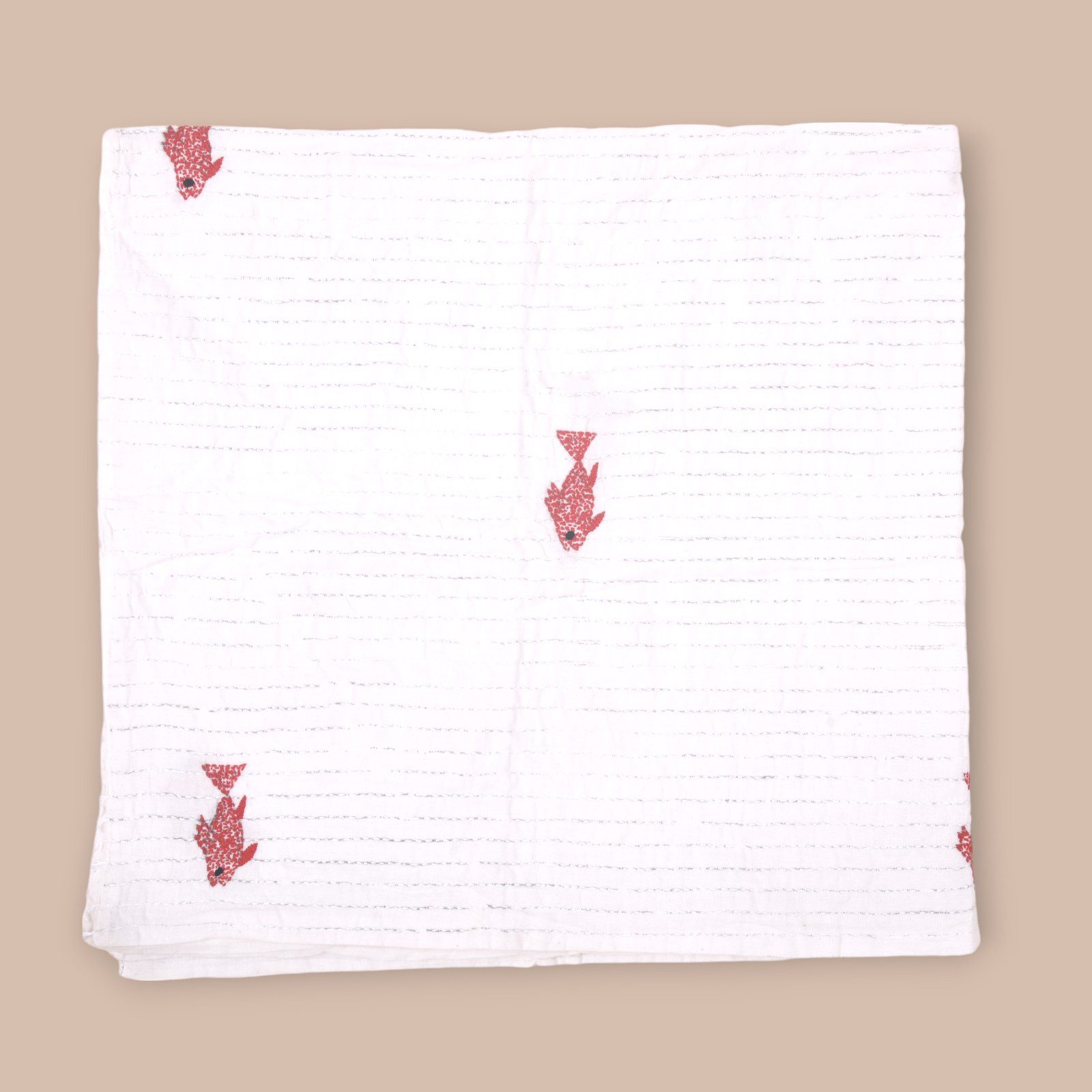 A charming Kantha sheet featuring playful fish motifs on a crisp white background, enhanced with intricate hand-stitched Kantha embroidery. Crafted from ultra-soft, breathable mulmul fabric, it ensures comfort while adding a touch of traditional artistry—perfect as a bedspread, throw, or decorative piece for your child’s space.