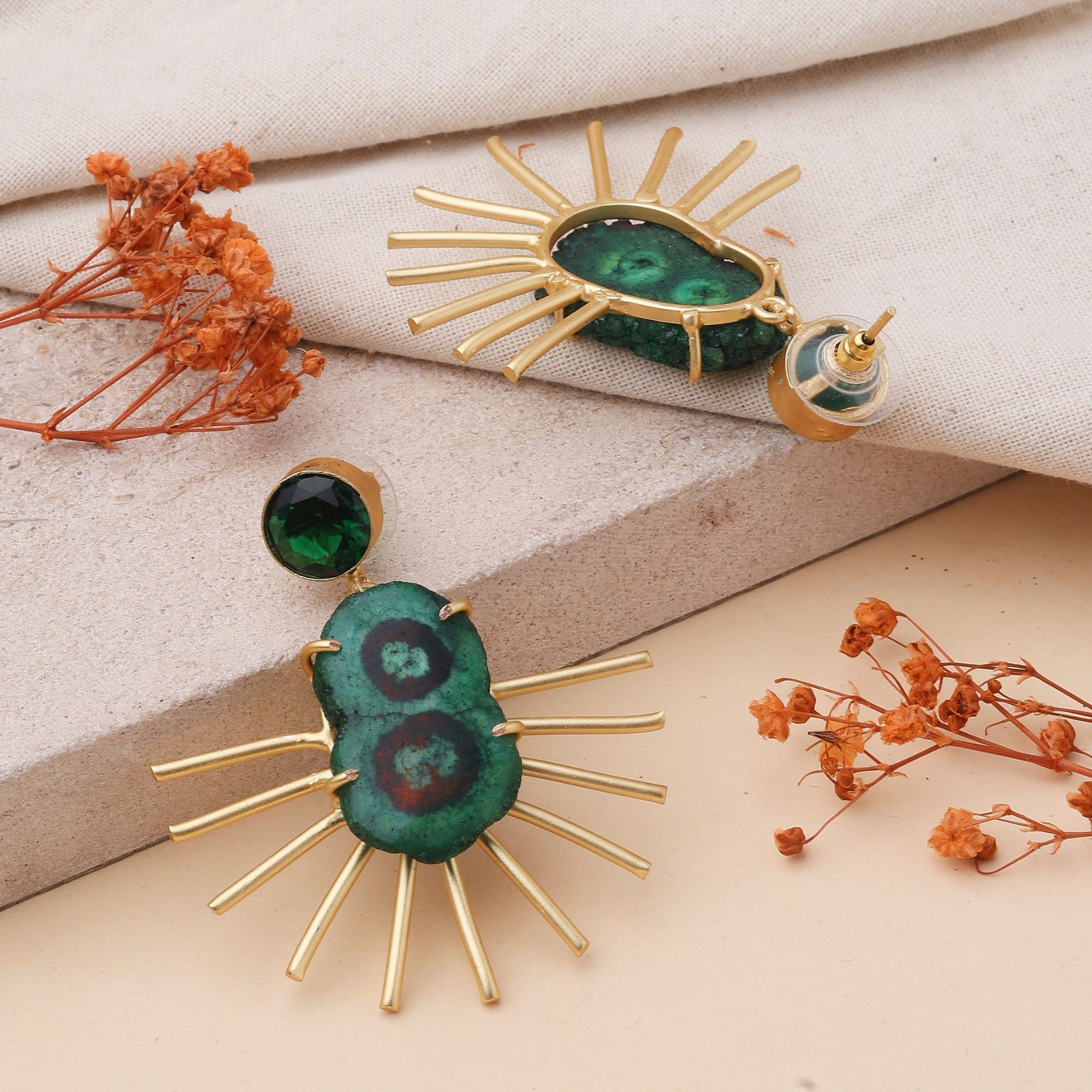 â—Ź Design: Striking green stones complemented by intricate stick details, creating a beautiful