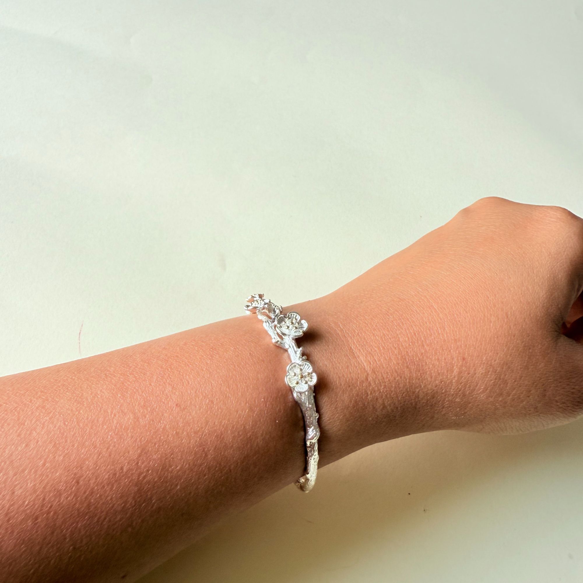 Delicate as a whisper, KKatha Bloom is a silver cuff bracelet inspired by the quiet poetry of spring. Handcrafted with intricate floral detailing, its design mimics blooming flowers on a gentle vine each petal sculpted to catch the light and tell a story of growth, grace, and feminine strength.