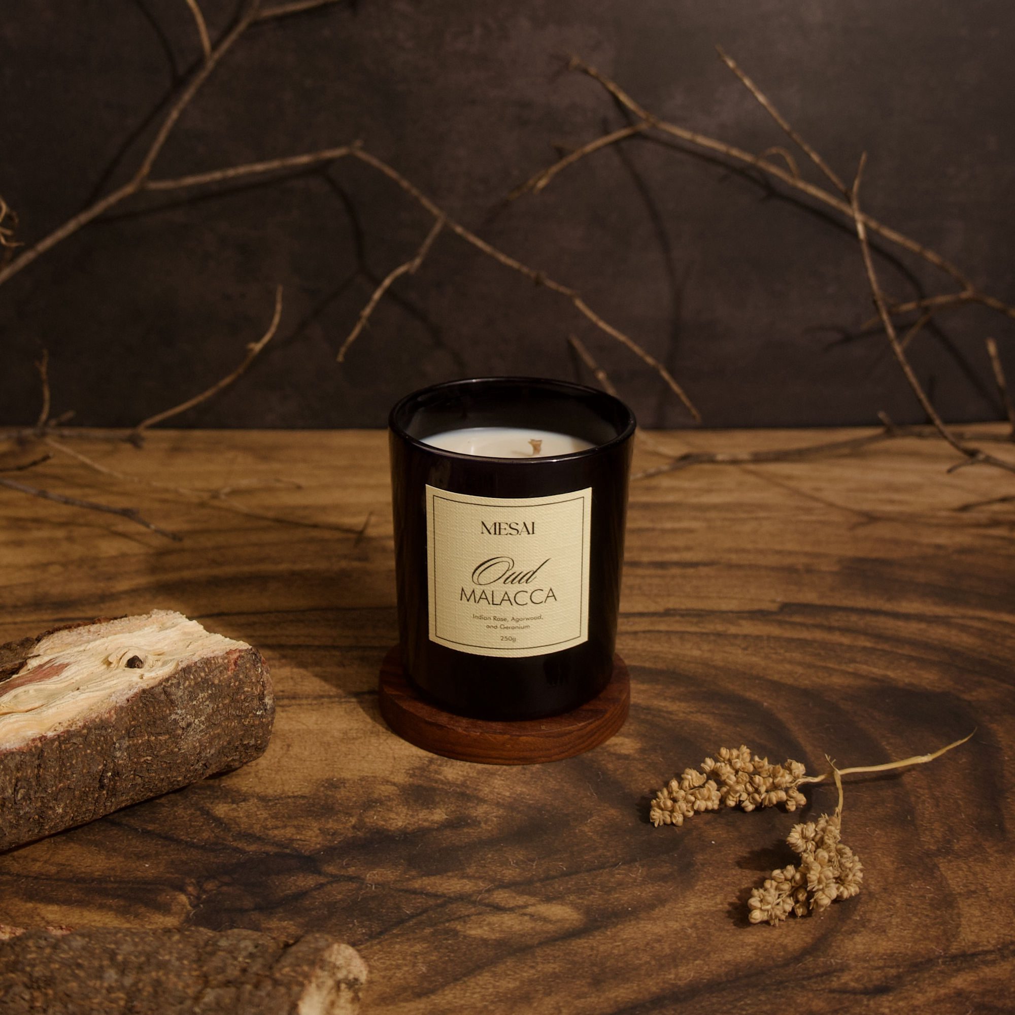 Oud Malacca soy candle – 50hr burn with agarwood, Indian rose, geranium & labdanum. A luxurious blend of grandeur & warmth.