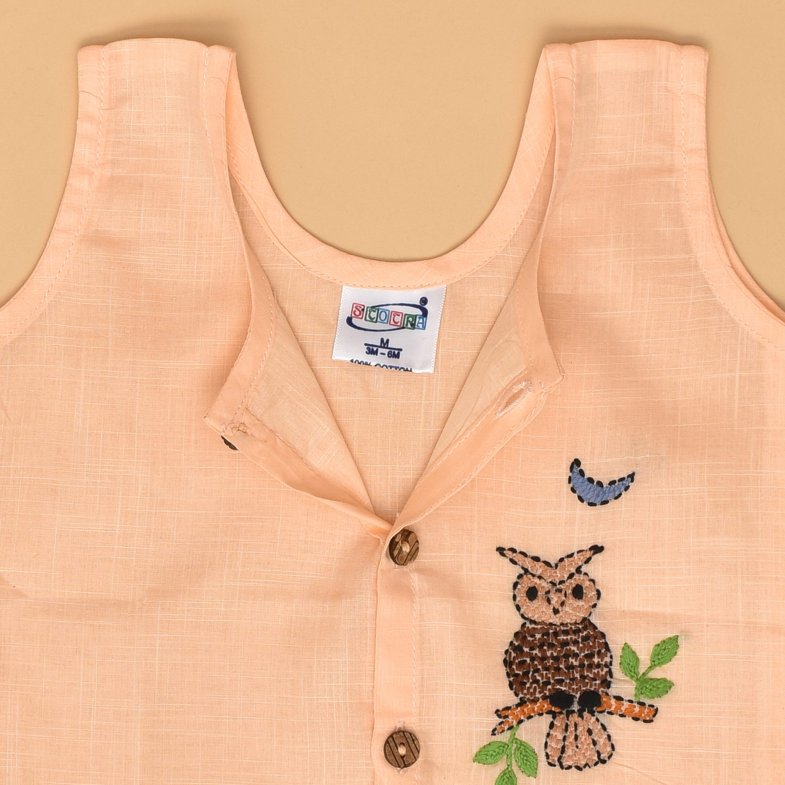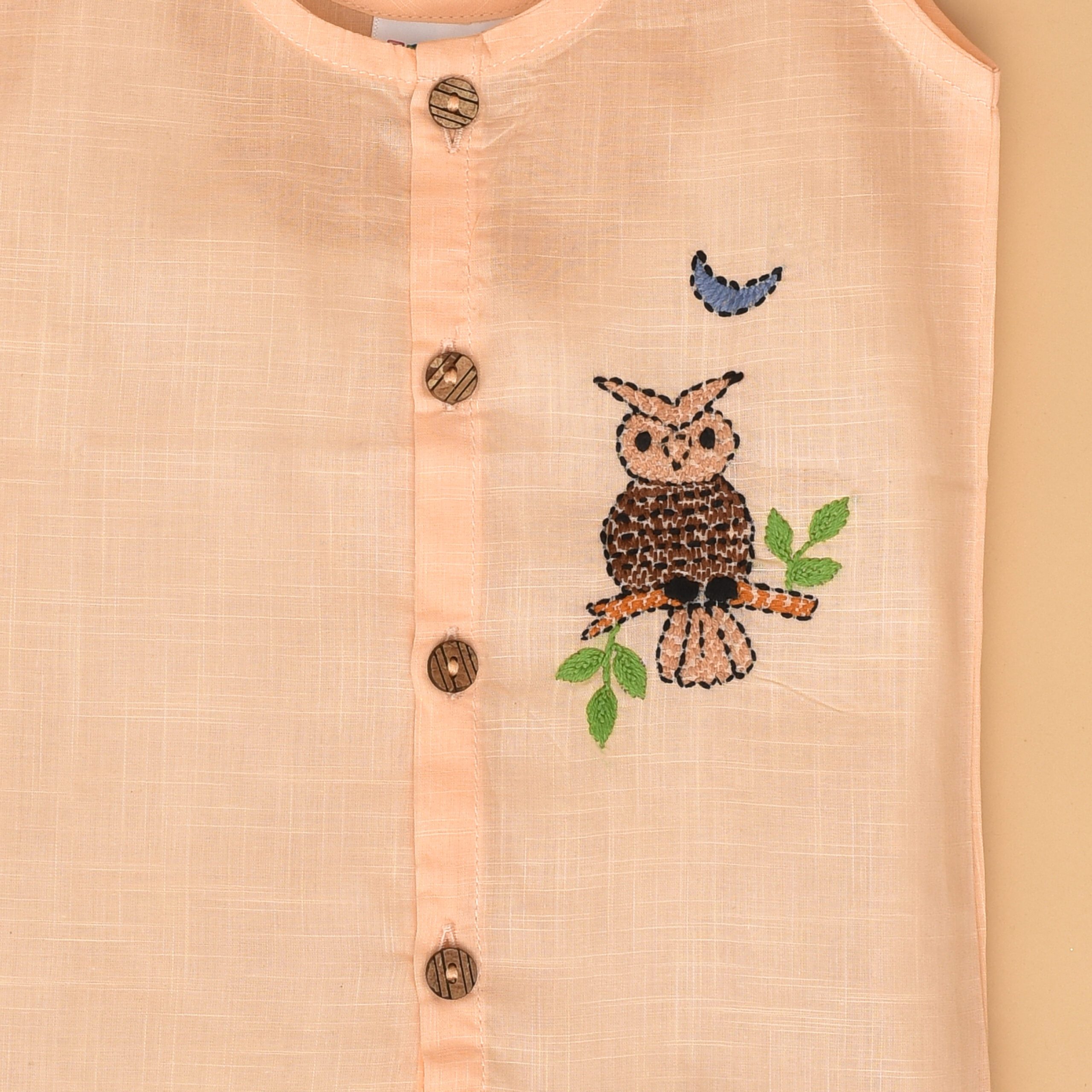 Peach Cotton Front Open Jabla for Babies with Night Owl Design Hand Embroidery