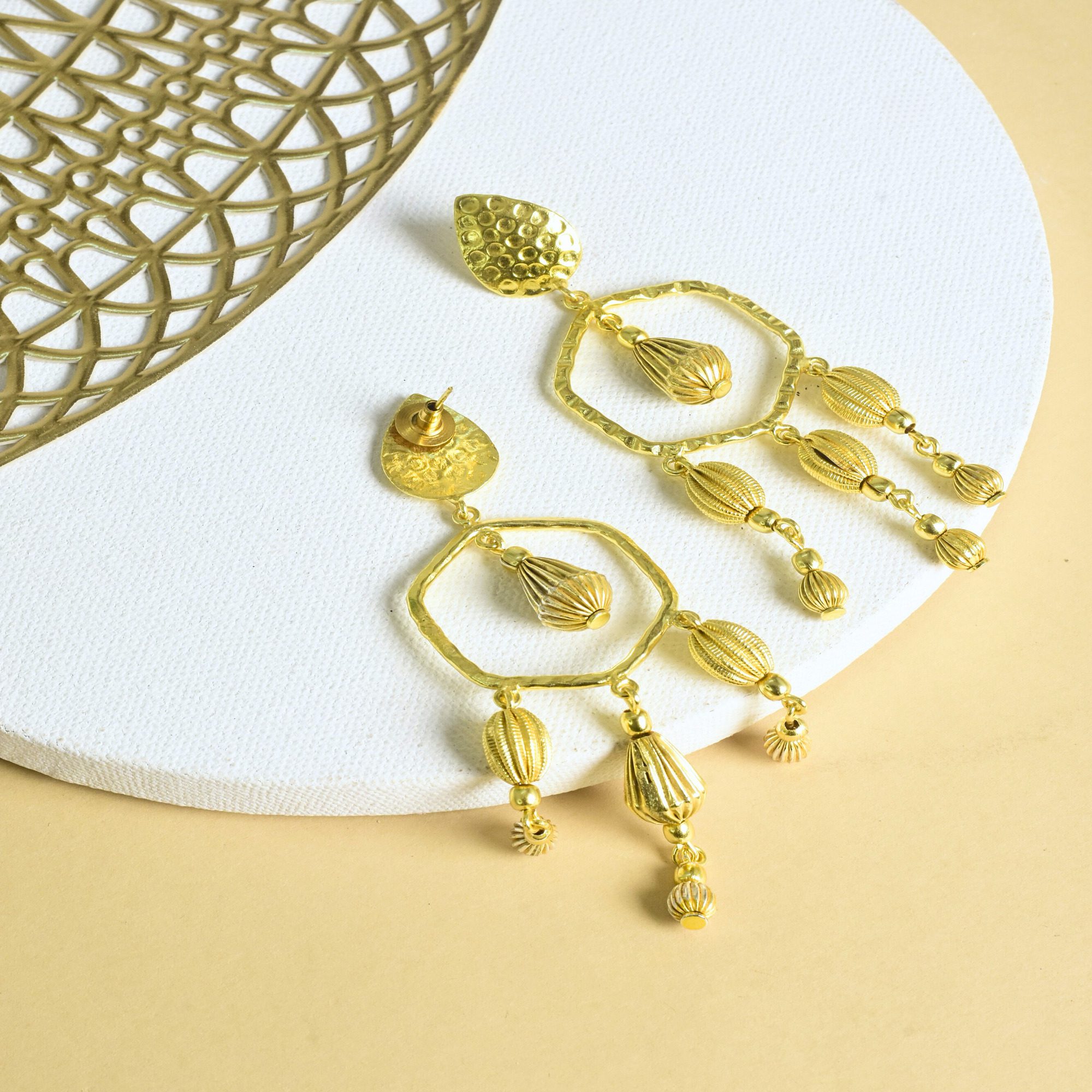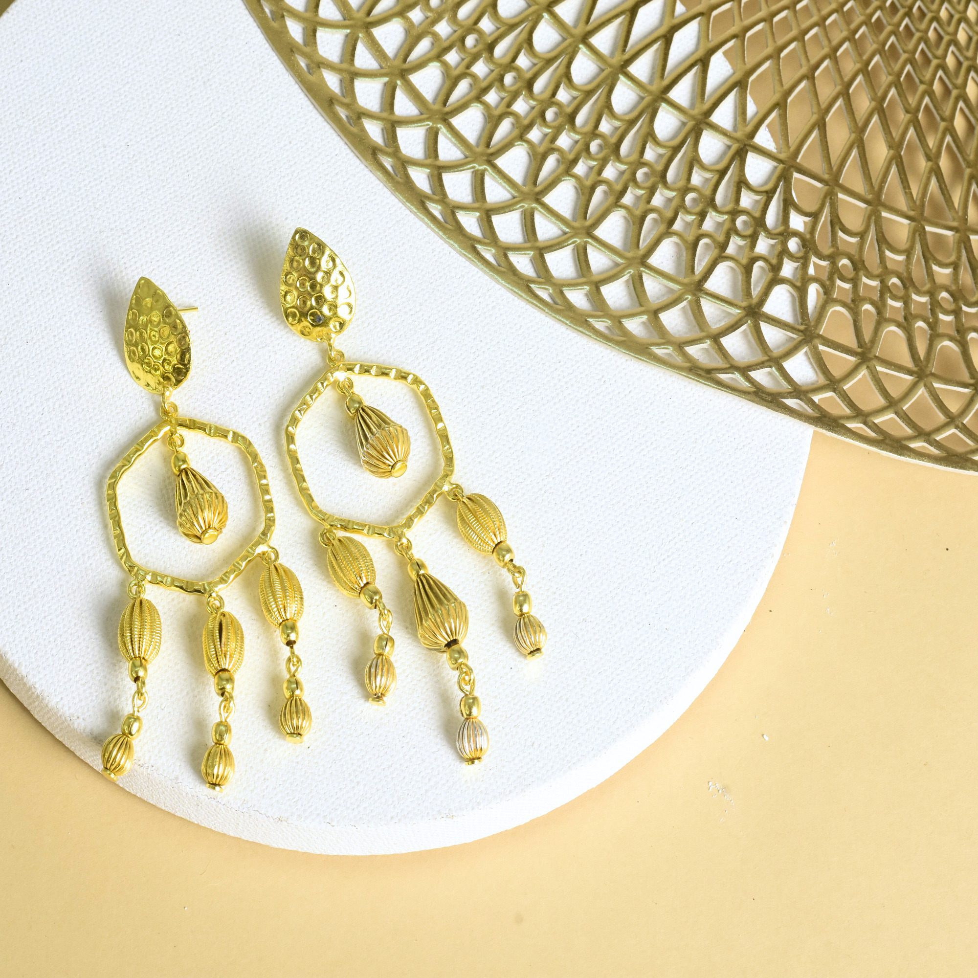Designed for the golden hour of every celebration, the Saanjh Earrings are a celebration of form, movement, and shine. Handcrafted in high-quality brass with a radiant gold finish, these long, flowing earrings bring drama and elegance in equal measure.