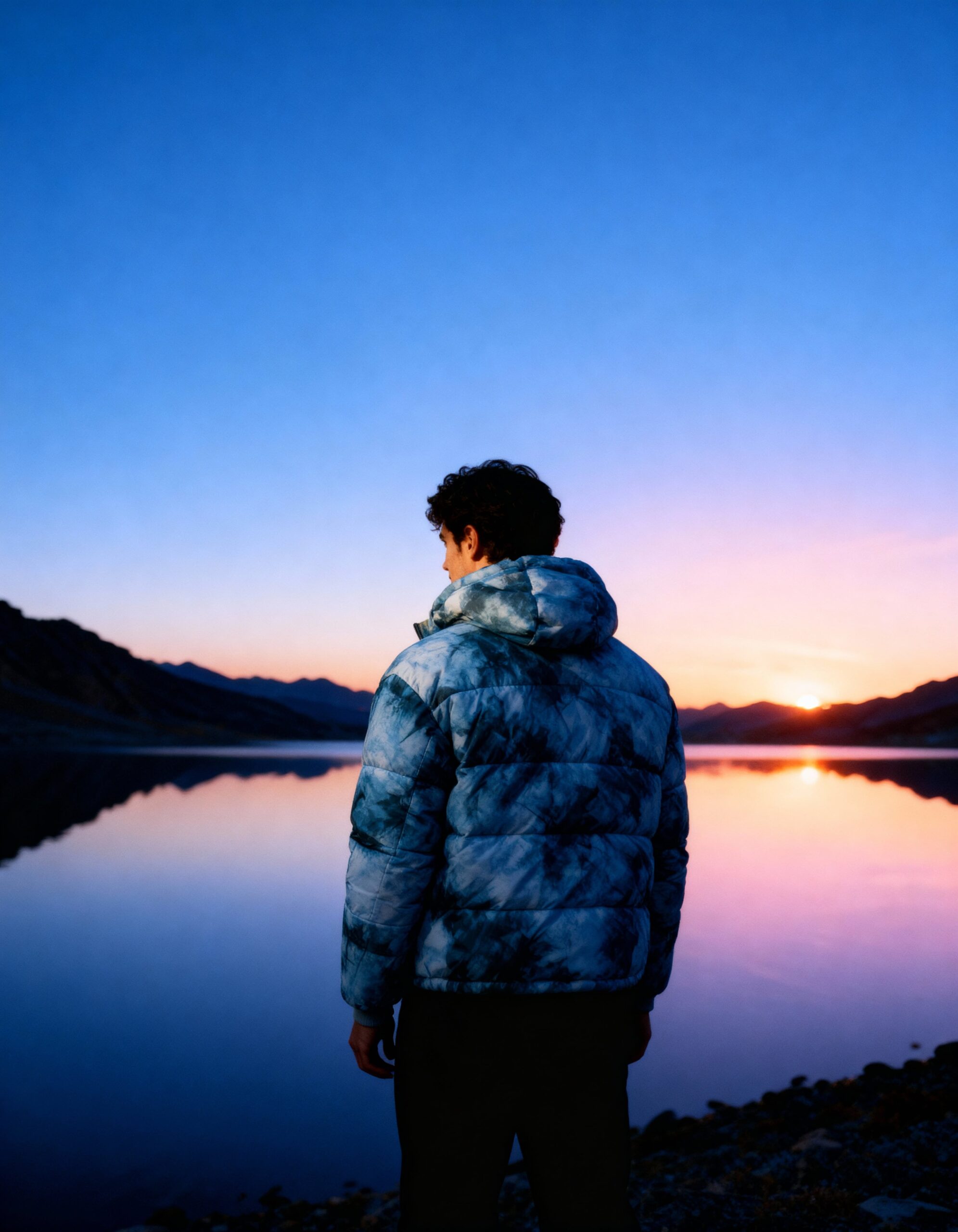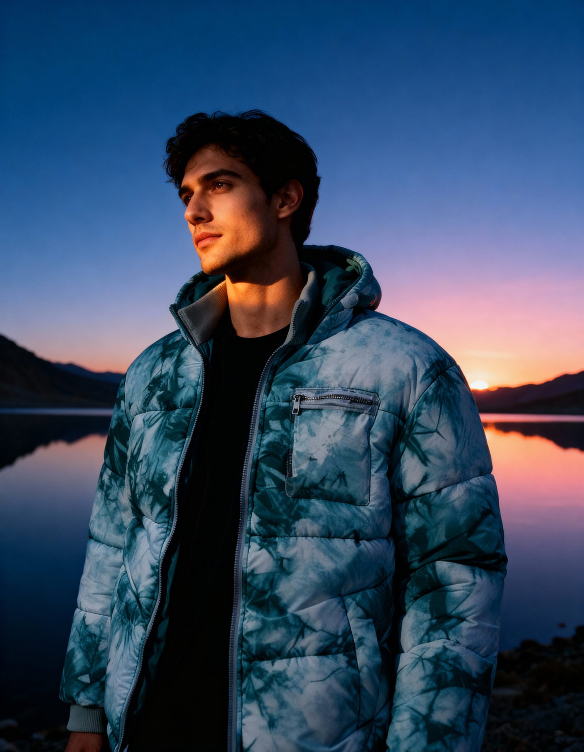Poly-fabric with tie-dye print having comfortable lining. Extended turtleneck with rib fabric.