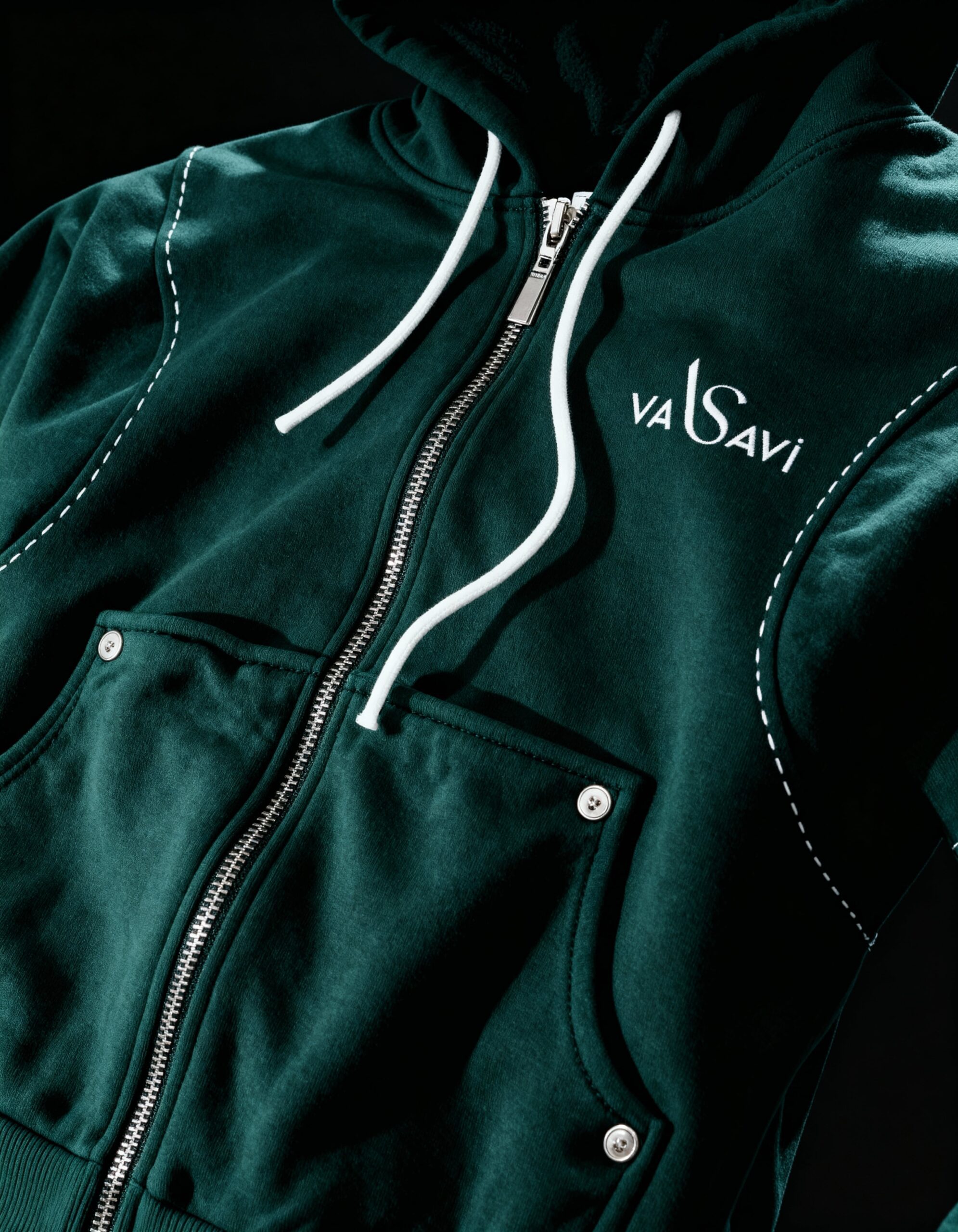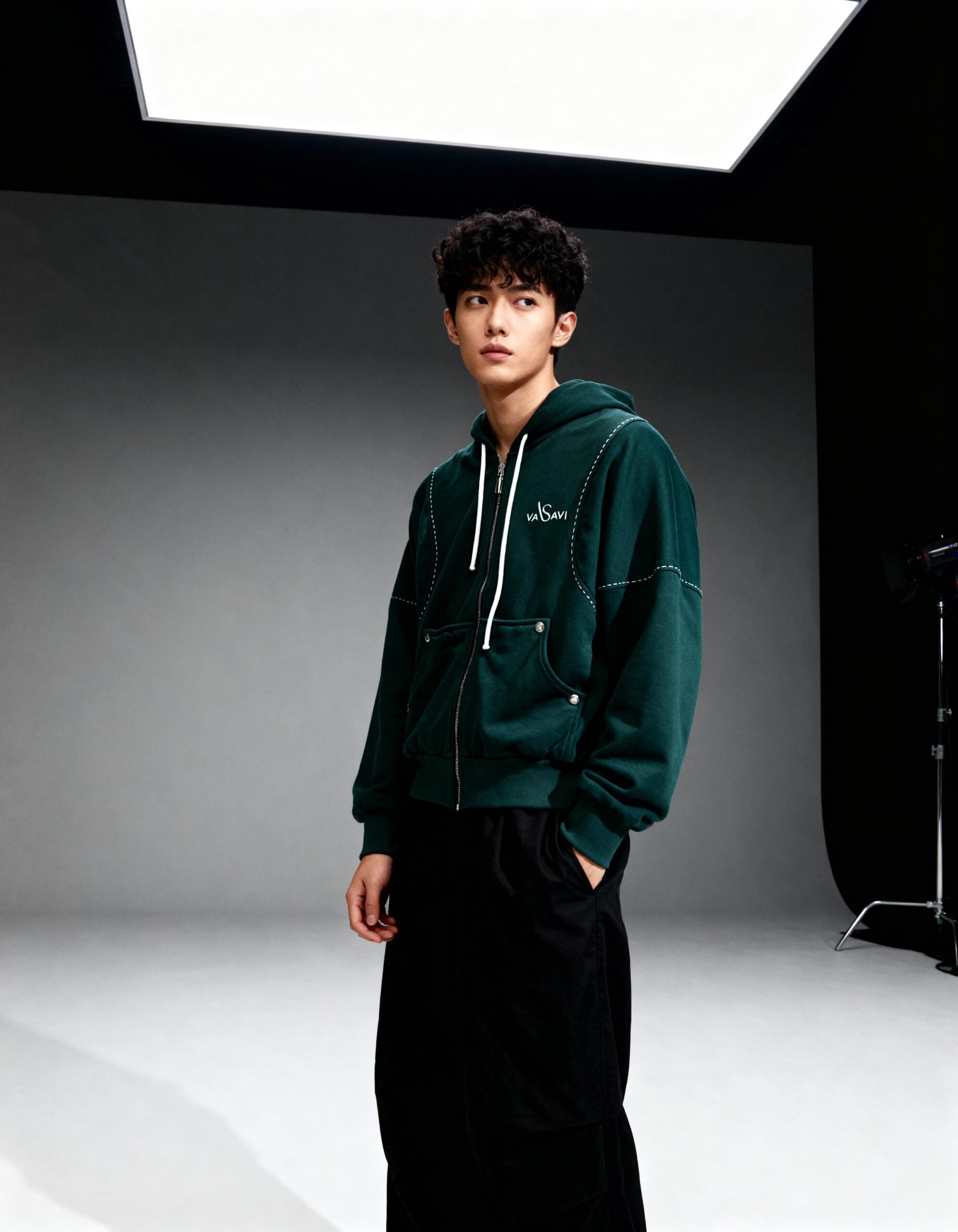 This green jacket, crafted from 320 GSM terry, combines classic stitch details with modern detachable pockets for versatile styling. Its relaxed fit merges timeless design with future-forward functionality.